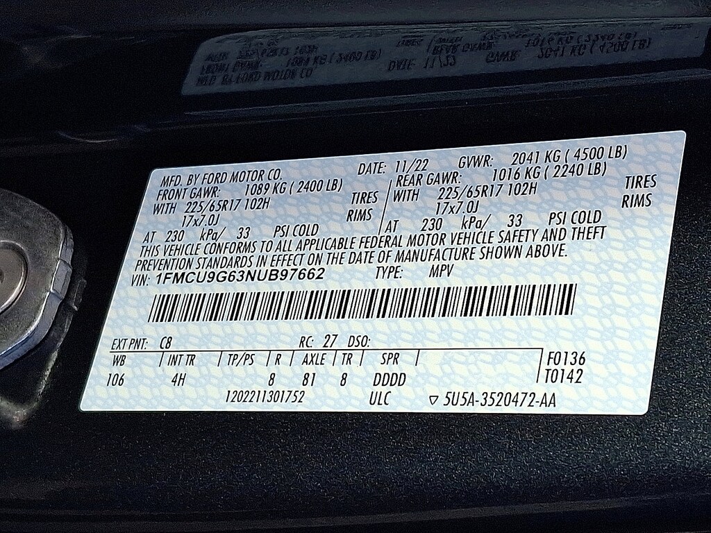 Valet Function, Unique Cloth Front Bucket Seats -inc: 6-way manual driver (fore/aft, up/down, recline) and 4-way manual front passenger (fore/aft w/manual recline), Trip Computer, Transmission: 8-Speed Automatic, Transmission w/Driver Selectable Mode and Oil Cooler, Tracker System, Tires: 225/65R17 AS BSW, Tire Specific Low Tire Pressure Warning, Tire Mobility Kit, Tailgate/Rear Door Lock Included w/Power Door Locks.